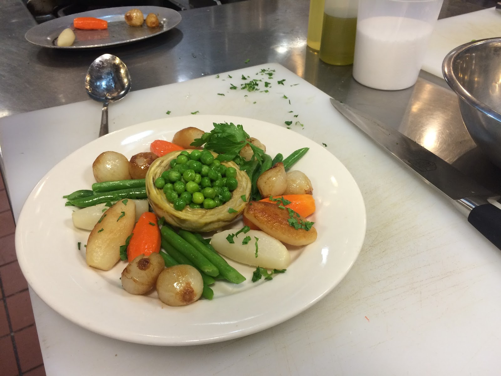 It was another evening of running towards school with a 30 pound bag of uniforms, knives and other tools. I sweated through my locker room routine, making sure I had on my pants, chef coat, apron, neckerchief, chef hat, and hall pass. Culinary school feels so masculine; the uniform erases almost all evidence that you’re a female, and then you spend hours working with knives, fire and steel under the supervision of male chefs, but I digress...